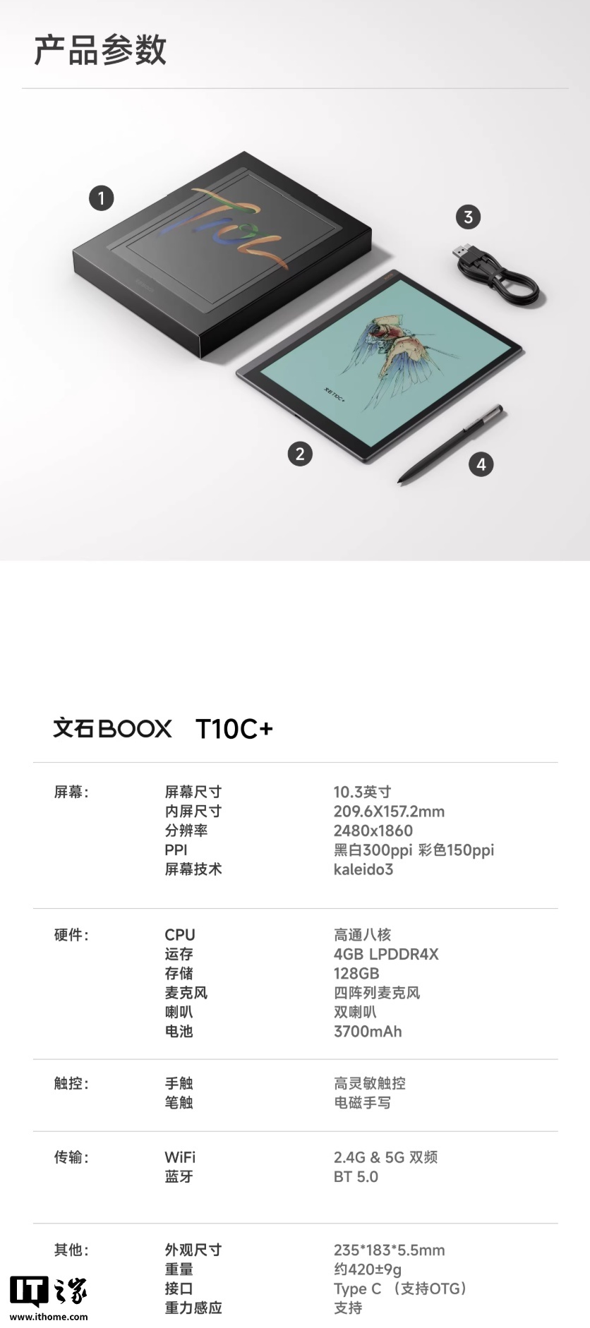 文石 T10C+ 采用平板造型,搭载 10.3 英寸 Kaleido3 彩色墨水屏(黑白 300PPI、彩色 150PPI),重约 420g,内置 3700mAh 电池。