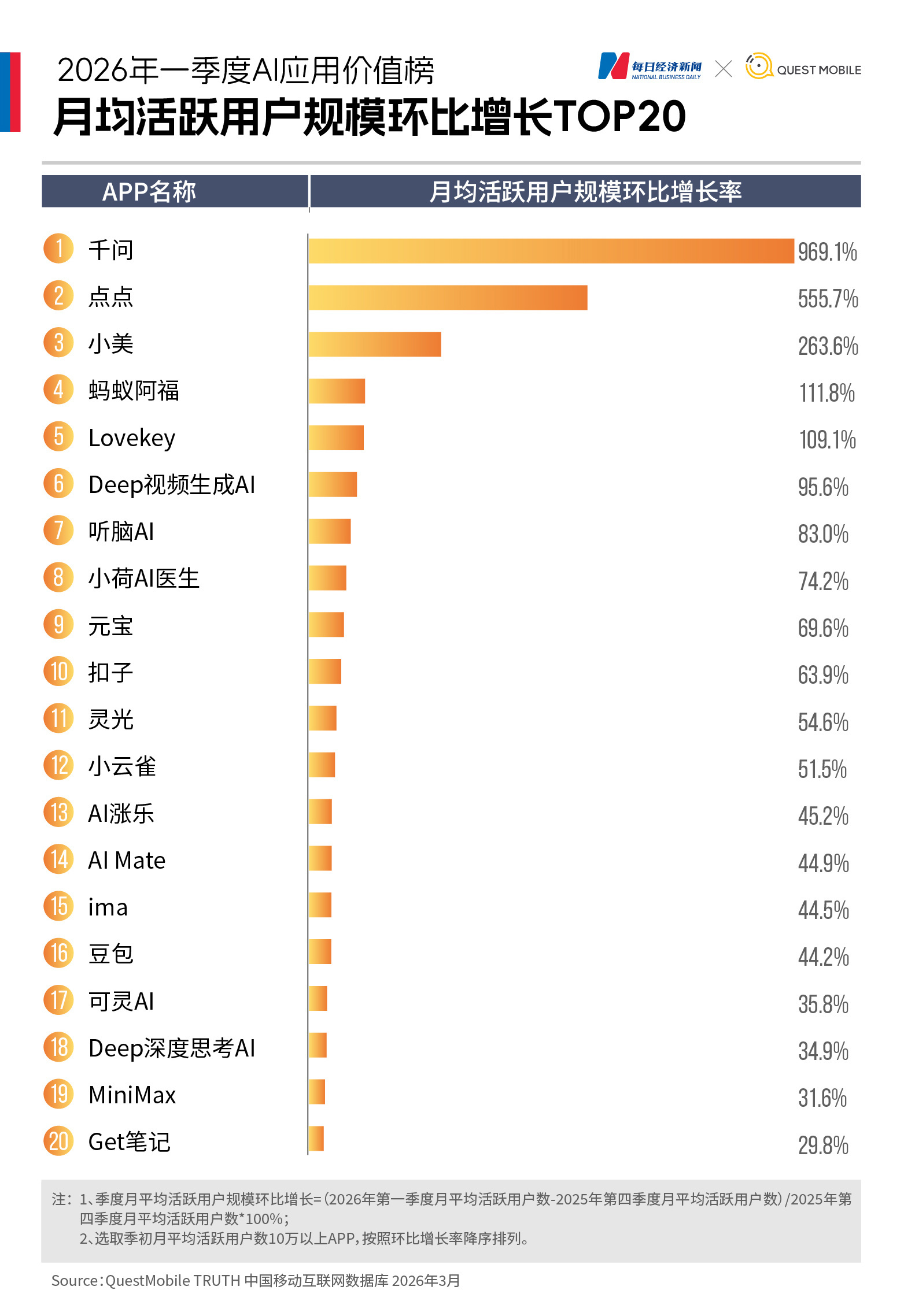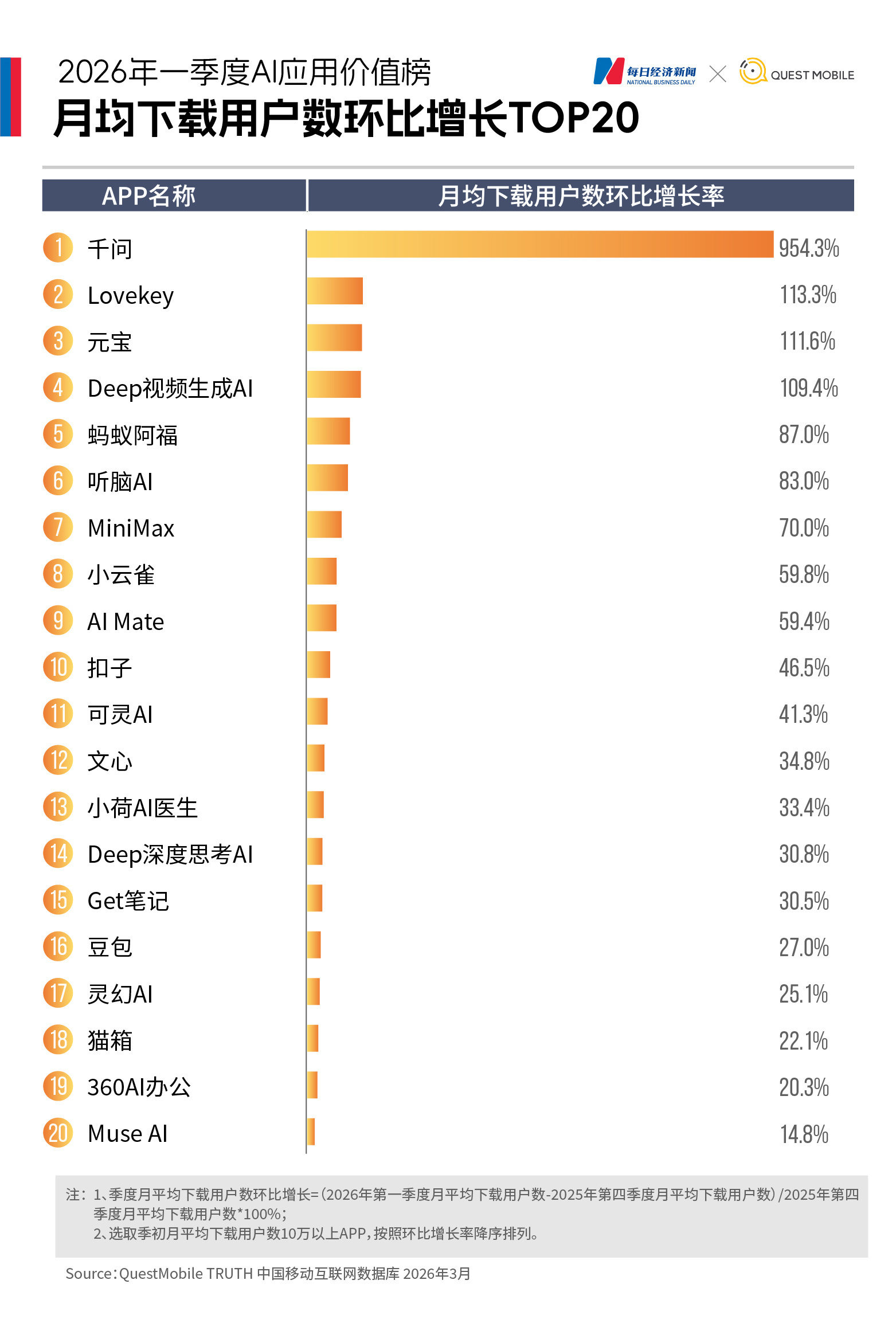 千问:一季度月均下载量7217.6万,较上季度环比增长954.3%,超过豆包登顶下载榜;一季度月活达1.66亿,环比增长969.1%,升至月活榜第二,打破过去一年由豆包、DeepSeek、元宝霸榜前三的格局。